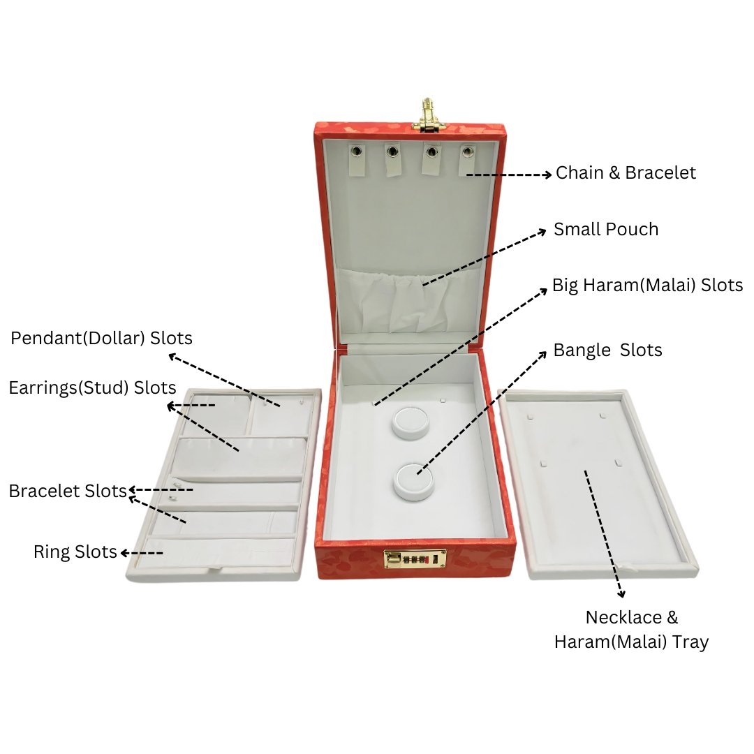 Whether you’re travelling or simply storing your valuables at home, this travel-friendly jewellery storage box provides peace of mind with its number-protected lock and well-arranged compartments. The smooth satin interior keeps every piece—rings, bangles, earrings, and chains—perfectly separated and easy to find.