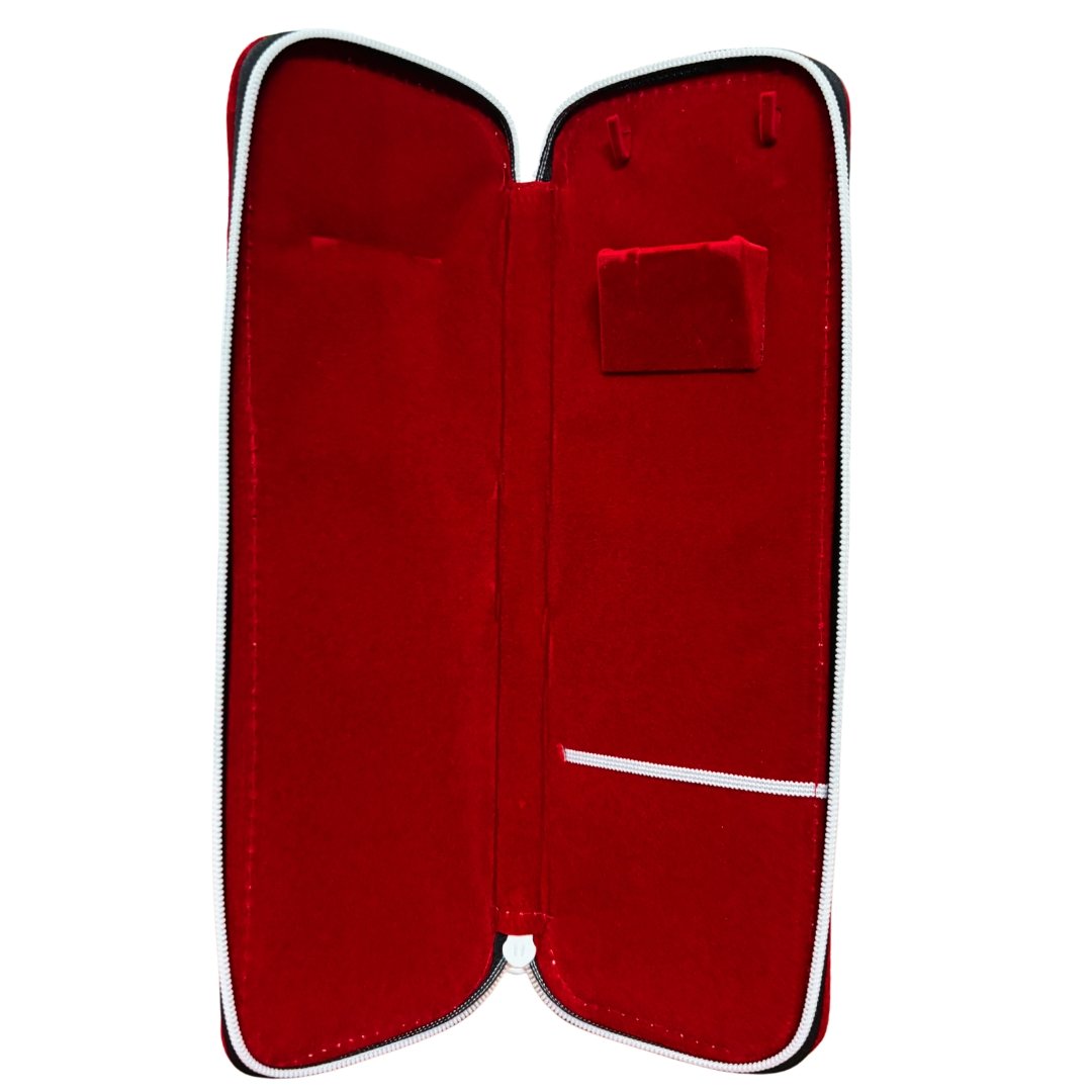 The TRIOMOONS Travel Jewellery Pouch is designed to protect and organize your favourite accessories with elegance. Crafted from high-quality red velvet and finished with a durable zip closure, this pouch is a must-have for every woman who values convenience and beauty.